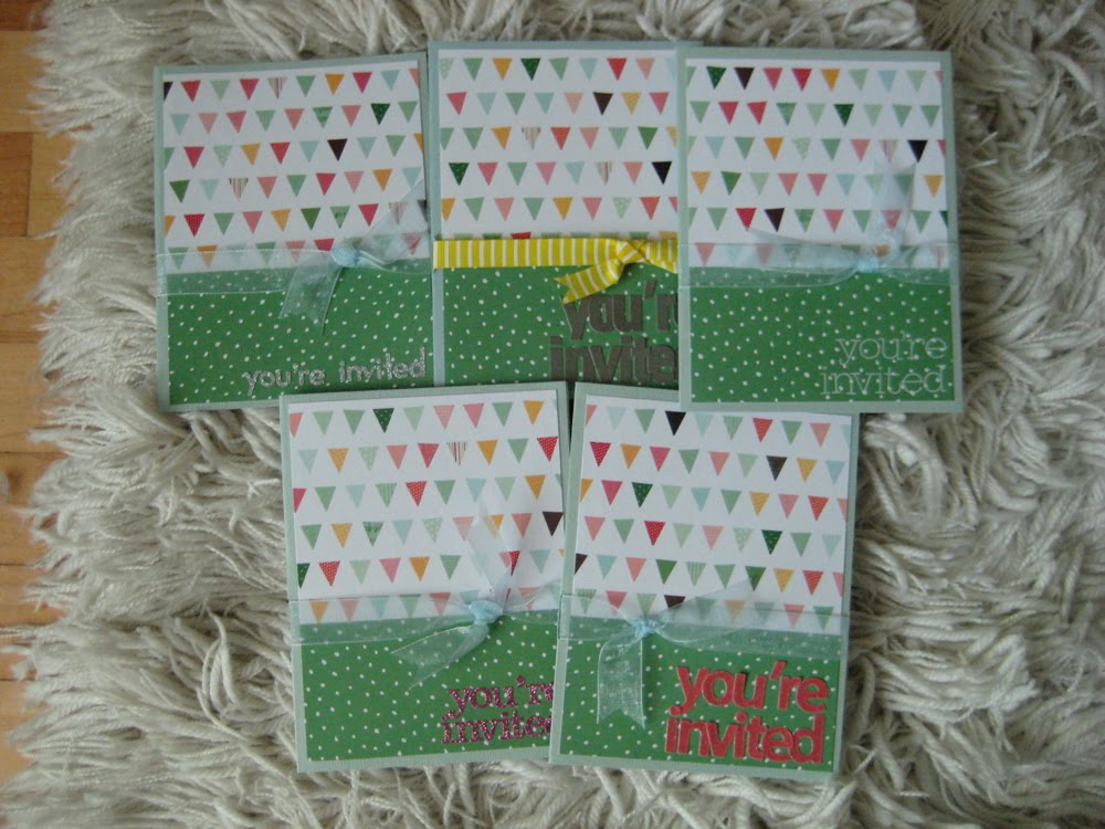 Once I have that figured out, I start the assembly line process. I cut up all the paper/ribbons/etc. I need and group them in piles. I then score and fold all the cards. Most of the time I stop before I have them all done because I’m too impatient and just want to see a finished invitation! So without further adieu, here’s what I came up with. It’s nothing fancy, but in the world of e-vites and Facebook event invites, getting an actual paper invitation in the mail, is always special.